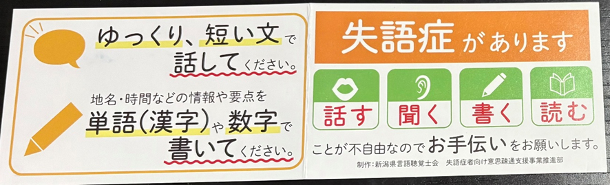また、失語症の方はカード(下参照)を持っていることがあります。カードには失語症があること、「こう接してほしい」ということが書かれています。コミュニケーションのヒントになりますね!